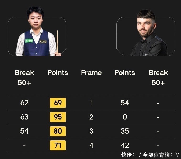 第二局,江俊不时用蹙迫压制克里斯-托顿,他又打出单杆63分,95-0零封敌手,比分来到2-0。第三局,克里斯-托顿得分蹙迫依旧乏力,江俊则是抓续发力,他又送出单杆54分,80-35胜出,比分上风扩大到3-0,强势赢得三个赛点。
